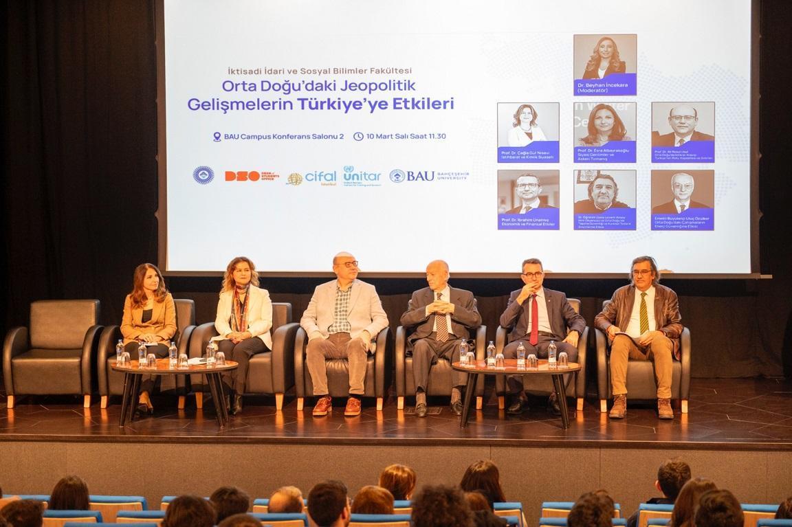 Bahçeşehir Üniversitesi (BAU) İktisadi, İdari ve Sosyal Bilimler Fakültesi tarafından ‘Orta Doğu’daki Jeopolitik Gelişmelerin Türkiye’ye Etkileri’ konulu panel düzenlendi. Etkinlikte, bölgedeki çatışmaların siyasi, askeri, ekonomik ve enerji boyutları ele alındı.