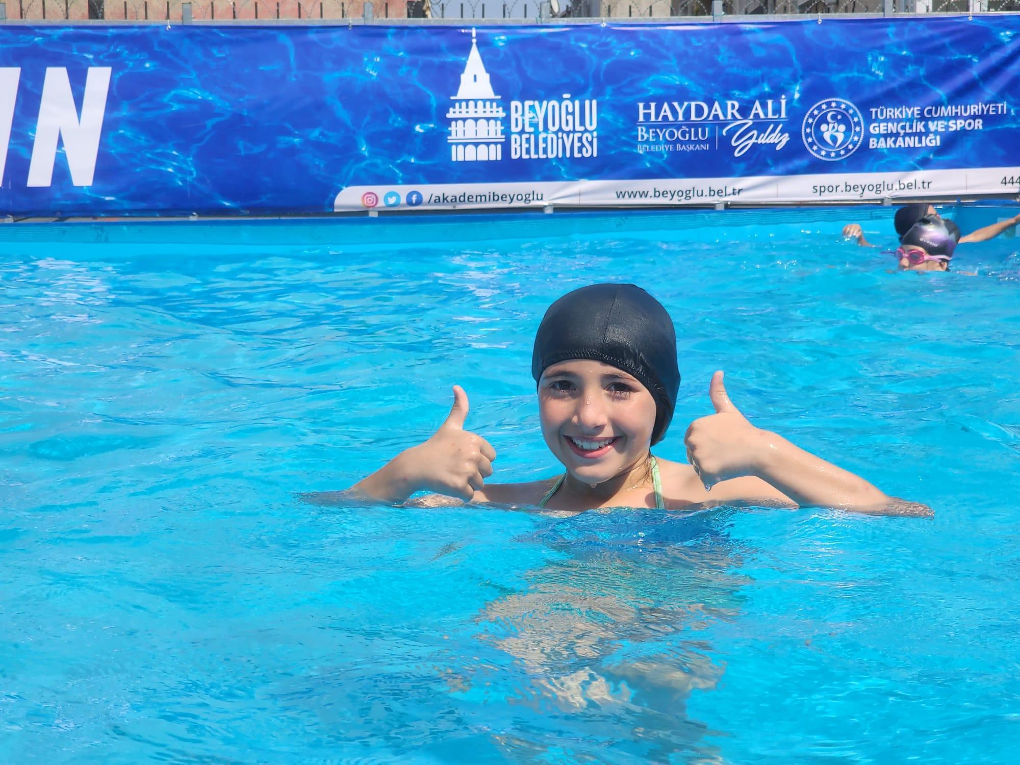 'Beyoğlu’nda Yüzme Bilmeyen Kalmasın' sloganıyla kurulan havuzlarda 7-11 yaş arasındaki çocuklara uzman antrenörler tarafından yüzme eğitimi veriliyor.