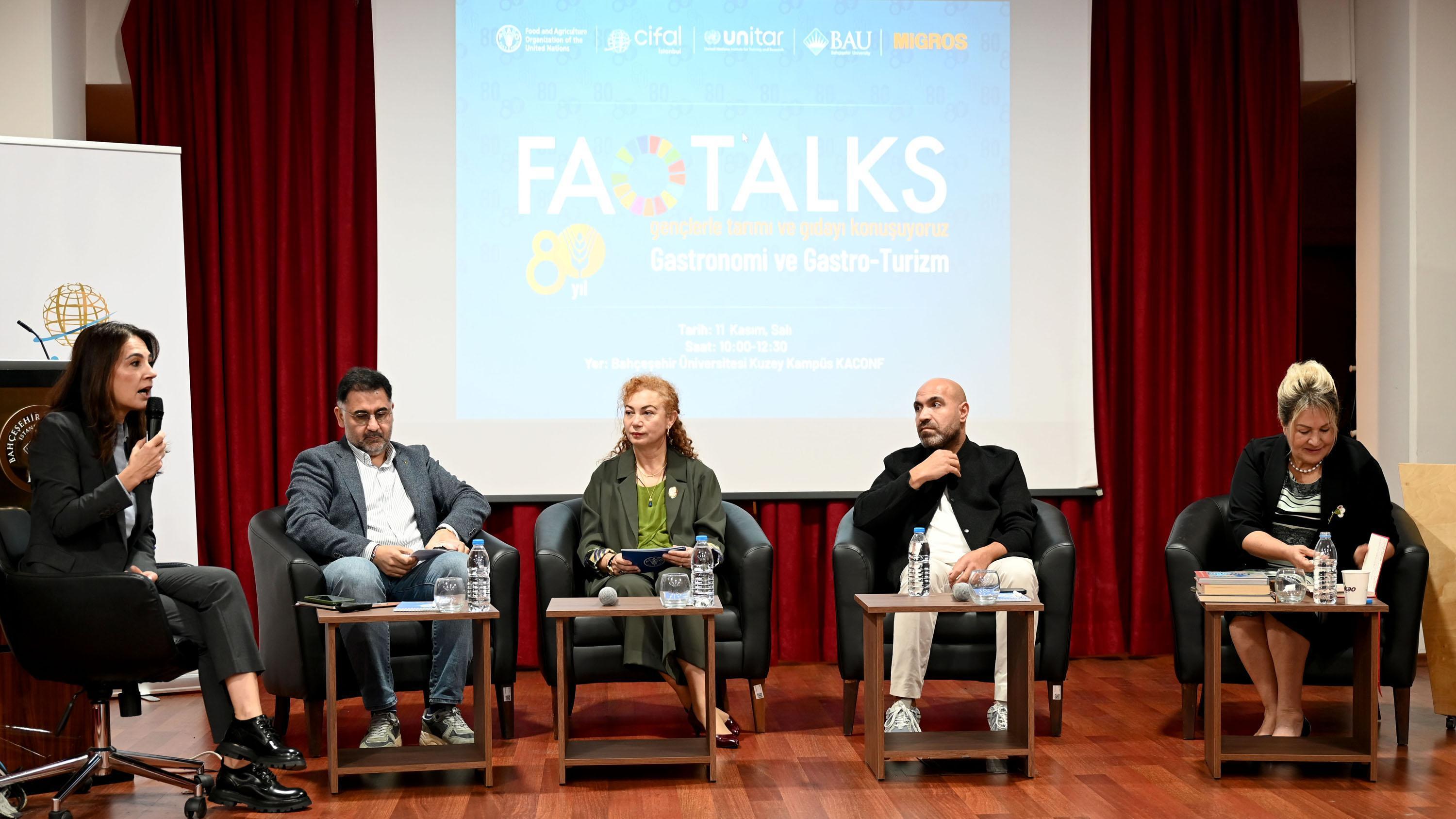 FAO Türkiye Temsilciliği, BM Eğitim ve Araştırma Enstitüsü (UNITAR) Yönetici ve Liderler için Uluslararası Eğitim Uygulama ve Araştırma Merkezi CIFAL İstanbul, Bahçeşehir Üniversitesi ve MİGROS iş birliğiyle düzenlenen ‘FAO Talks: Gençlerle Tarımı ve Gıdayı Konuşuyoruz’ etkinliği BAU Kuzey Kampüs’te gerçekleşti. Sürdürülebilir üretim, gıda güvenliği ve iklim dostu tarım politikaları konularında farkındalık oluşturmak ve gençlerin bilgi birikimiyle enerjilerinin Sürdürülebilir Kalkınma Amaçları’na (SKA) katkısını teşvik etmek amacıyla planlanan etkinliğin açılışında CIFAL İstanbul - UNITAR Direktörü Prof. Dr. Çisil Sohodol, FAO Türkiye Temsilci Yardımcısı Dr. Ayşegül Selışık, BAU Uygulamalı Bilimler Müdürü Prof. Dr. Kazım Ozan Özer, BAU Sağlık Bilimleri Fakültesi Dekan Yardımcısı Dr. Öğr. Üyesi İlayda Altuncevahir, Migros Sürdürülebilirlik Müdürü Murat Birsin konuşma yaptılar.