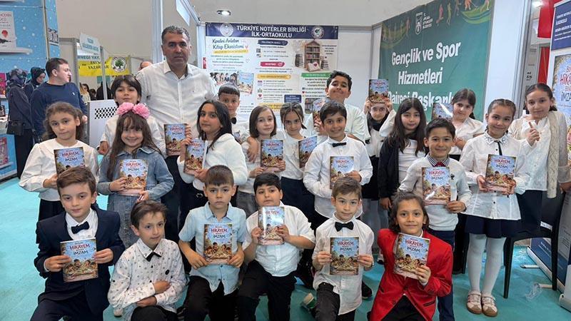 Türkiye Noterler Birliği İlkokulu 3-A sınıfı öğrencileri tarafından hazırlanan, geliri deprem bölgesindeki okullara aktarılacak, 'Benim Hikayem Benim İmzam' adlı kitap, 23'üncü Ankara Kitap Fuarı'nda okurlarla buluştu.