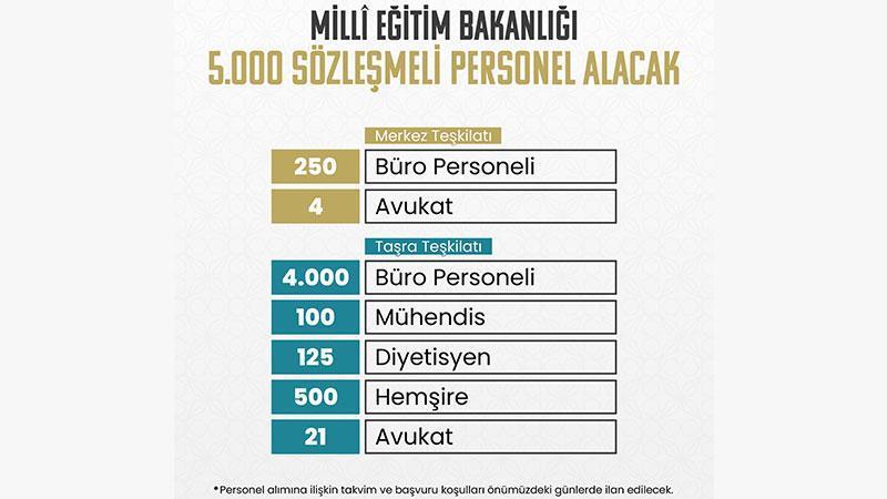 Ayrıca Bakan Özer'in paylaştığı görsele göre, merkez teşkilatına 250 büro personeli ve 4 avukat; taşra teşkilatına ise 4 bin büro personeli, 100 mühendis, 125 diyetisyen, 500 hemşire ve 21 avukat alınacak. Personel alımına ilişkin takvim ve başvuru koşullarının önümüzdeki günlerde ilan edileceği belirtildi.