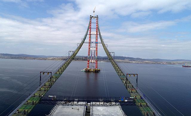 1915 Çanakkale Köprüsü'nde kedi yolunun tamamlanmasıyla başlanan ana kabloların montajında sona yaklaşıldı. Köprünün ana halatlarını oluşturacak 296 çelik kablodan 220'ncisi bir kıtadan diğer kıtaya çekildi. Gemlik ve Gölcük'teki fabrikalarda üretilen tabliye bloklarından 42'ncisi de Gelibolu Sütlüce'deki şantiye alanına ulaştı. Ana halatların bu ay sonuna kadar tamamlanarak, tabliye bloklarının montajına başlanacağı öğrenildi.