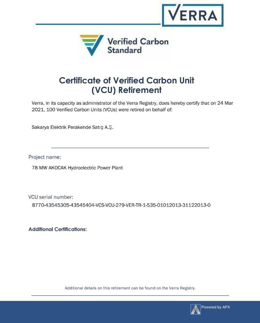Türkiye genelinde 4 milyon kişiye elektrik hizmeti sunduğunun altını çizen şirket, genel müdürlük ve 26 adet müşteri hizmetleri merkezinde karbon salınımını azaltmak ve sıfır karbonlu tüketime geçmek için 2021 yılı boyunca yeşil enerji kullanacağını taahhüt eden Verified Carbon Standart (VCS) sertifikası aldı. 1 Ocak- 31 Aralık tarihlerinde 200 bin kWh’lık elektrik tüketiminden kaynaklanan karbon ayak izi nötrlenecek. Sepaş Enerji, 100 teqCO2 VCS sertifikasıyla yıl boyunca 303 ağaca eş değer miktarda karbon salınımı azaltacağını bildirdi.