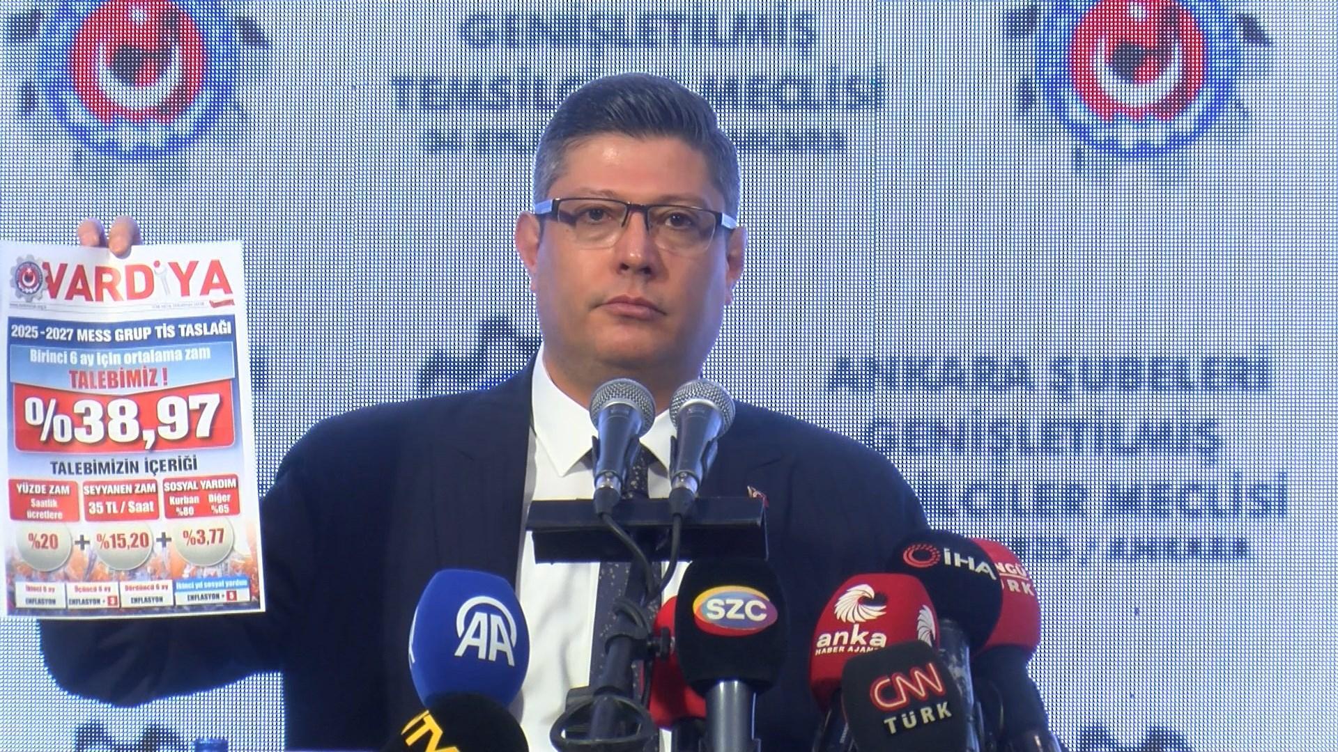 Altundağ, "2025- 2027 yılları arasında iki yıllık olacak şekilde teklif ettiğimiz Türk Metal-MESS Grup Toplu İş Sözleşmesi taslağımızda ilk 6 ay için zam talebimiz yüzdelik zam artı seyyanen zam formülünden oluşuyor. Sözleşme kapsamındaki üyelerimizin 31 Ağustos 2025 tarihindeki saat ücretlerine 1 Eylül 2025'ten geçerli olmak üzere ilk 6 ay için önce 20 zam talep ediyoruz. Bu zammın uygulanmasının ardından yine tüm üyelerimizin saat ücretlerine ilk 6 ay için seyyanen 35 lira daha zam talep ediyoruz. Böylece istediğimiz bu iki zammın sonucu olarak MESS Grup Toplu İş Sözleşmesi kapsamındaki üyelerimizin saat ücretlerine ilk 6 ay için ortalama yüzde 35,2 zam talep etmiş oluyoruz" dedi.