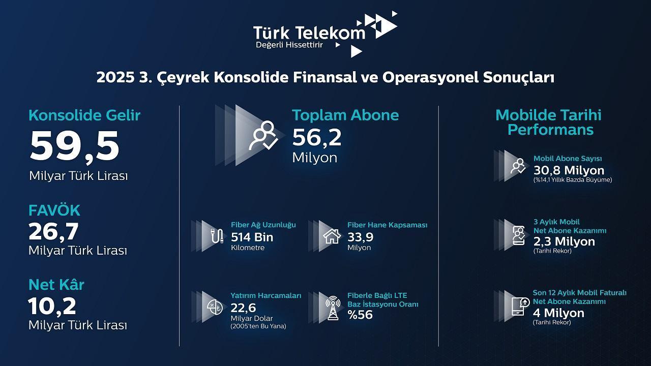 Türk Telekom, 2025'in üçüncü çeyreğinde konsolide gelirlerini geçen yılın aynı dönemine göre yüzde 10,7 artışla 59,5 milyar TL'ye yükseltti. Sabit internet ve mobil, kurumsal data ile birlikte büyümeye bir kez daha öncülük ederken Türk Telekom'un üçüncü çeyrekteki FAVÖK'ü yüzde 21,6'lık artışla 26,7 milyar TL'ye ulaştı. Üçüncü çeyrekteki net karı 10,2 milyar TL olan Türk Telekom, bu çeyrekte 21,7 milyar TL'lik yatırım gerçekleştirdi.