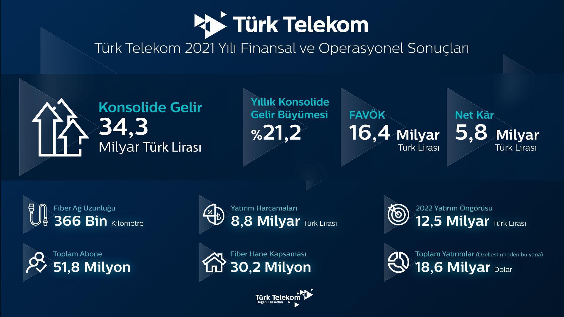 Türk Telekom, 2021 yıl sonu finansal ve operasyonel sonuçlarını açıkladı. 2021’i yüzde 21,2 gelir artışı ile kapatan Türk Telekom’un yıllık konsolide geliri 34,3 milyar TL’ye, net kârı ise 5,8 milyar TL’ye ulaştı. 2021 yılı yatırım harcamalarını 8,8 milyar TL olarak açıklayan Türk Telekom’un, 1,5 milyon net abone kazanımı ile abone sayısı ise 51,8 milyonu aştı. Türk Telekom CEO’su Ümit Önal, “Herkesi değerli hissettirmek için çıktığımız yolda başarılı bir yılı geride bıraktık" dedi.