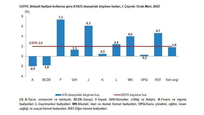 TÜİK, bu yılın birinci çeyreğine ilişkin dönemsel GSYH verilerini açıkladı. Buna göre; GSYH 2025 yılı birinci çeyrek ilk tahmini zincirlenmiş hacim endeksi olarak, bir önceki yılın aynı çeyreğine göre yüzde 2 arttı. GSYH'yi oluşturan faaliyetler incelendiğinde; inşaat sektörü toplam katma değeri yüzde 7,3, bilgi ve iletişim faaliyetleri yüzde 6,1, diğer hizmet faaliyetleri yüzde 4,7, mesleki, idari ve destek hizmet faaliyetleri yüzde 4, gayrimenkul faaliyetleri yüzde 2,4, ürün üzerindeki vergiler eksi sübvansiyonlar yüzde 1,8, hizmetler yüzde 1,3, finans ve sigorta faaliyetleri yüzde 0,5 ve kamu yönetimi, eğitim, insan sağlığı ve sosyal hizmet faaliyetleri yüzde 0,3 arttı. Tarım sektörü yüzde 2, sanayi ise yüzde 1,8 azaldı. Üretim yöntemiyle GSYH tahmini, 2025 yılının birinci çeyreğinde cari fiyatlarla bir önceki yılın aynı çeyreğine göre yüzde 36,7 artarak 12 trilyon 125 milyar 173 milyon TL oldu. GSYH'nin birinci çeyrek değeri cari fiyatlarla ABD doları bazında 335 milyar 504 milyon olarak gerçekleşti.