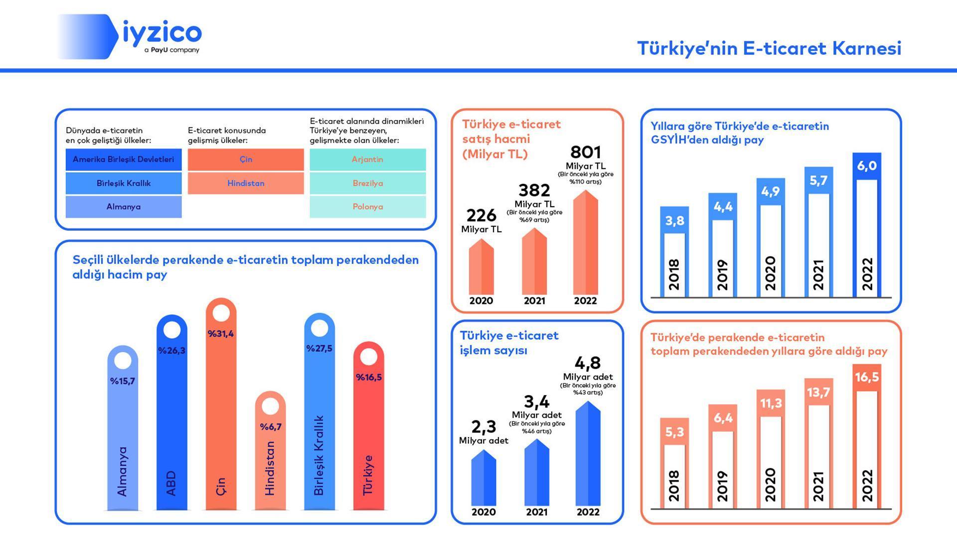 Bugün açıklanan Türkiye E-Ticaret Ekosistemi Raporu'na göre e-ticaret sektörü bir önceki yıla göre yüzde 110 artış göstererek 801 milyar lira satış hacmine ulaştı. Yıllara göre Türkiye'de e-ticaretin 2022'de Gayrisafi Yurt İçi Hasıla'dan (GSYİH) aldığı pay yüzde 6 oldu. Ayrıca e-ticaret işlem sayıları 2020 yılındaki değerinin 2 kat üzerine çıkarak 4.8 milyar adede yükseldi.