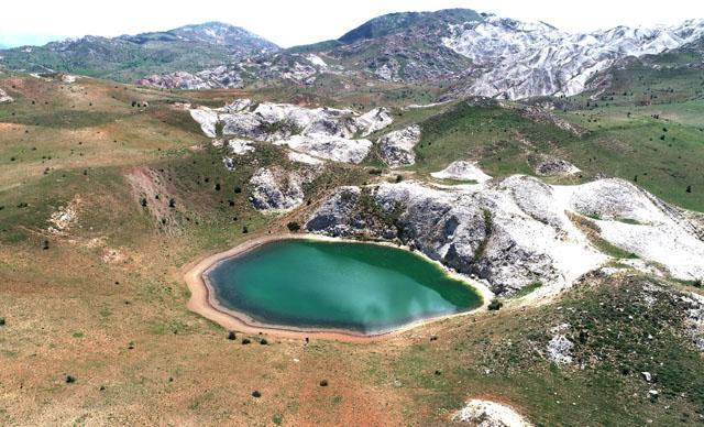 Yeşilgöl, which is formed by boiling water from the bottom of the karst land in the village of Toptas, takes its name from its color, fascinates those who see it. The lake, which is frequently visited by nature and photography enthusiasts, was also viewed from the air with a drone by DHA.