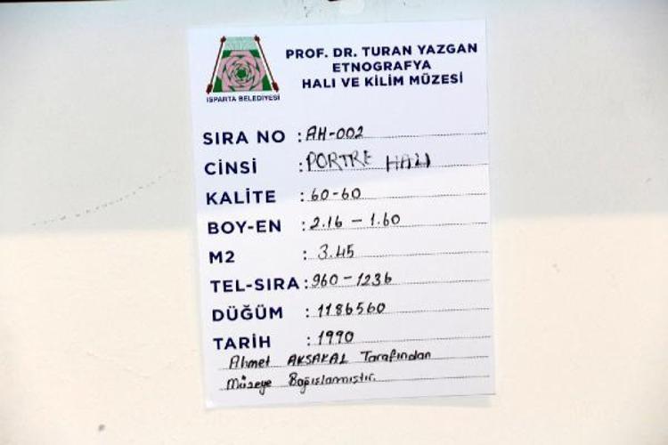 Isparta'da halı, kilim ve etnografik ürünlerin sergilendiği Prof. Dr. Turan Yazgan Etnografya Müzesi'nde sanatçı Ahmet Aksakal'ın yaptığı Mustafa Kemal Atatürk'ün fotoğrafının bulunduğu 3 boyutlu halı sergileniyor. 1 milyon 186 bin 560 düğüm atılıp, 120 renk ip kullanılarak dokunan portre halı, müzede türündeki tek halı olma özelliği taşıyor.