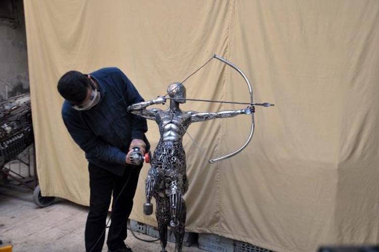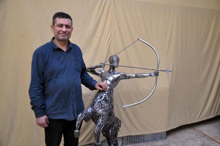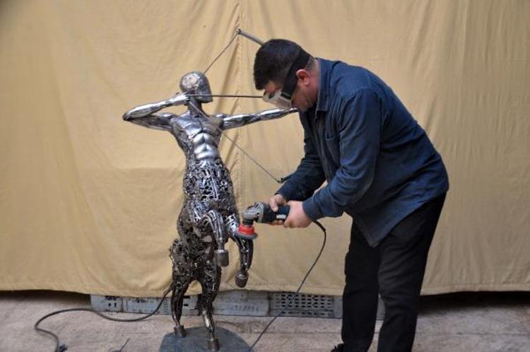 Hatay'da mozaik ve heykel sanatçısı Mervan Altınorak, 10 bin parça mekanik hurda ve evsel atıktan oluşan 'Sentor' adlı heykel yaptı. 50 kilogram ağırlığında, 1,5 metre boyundaki heykelin geliri, depremzedelere bağışlanacak.