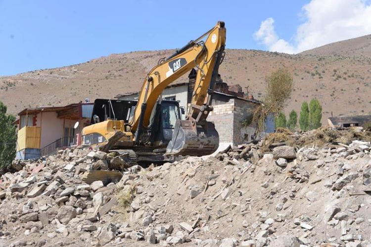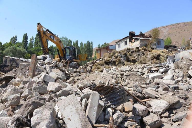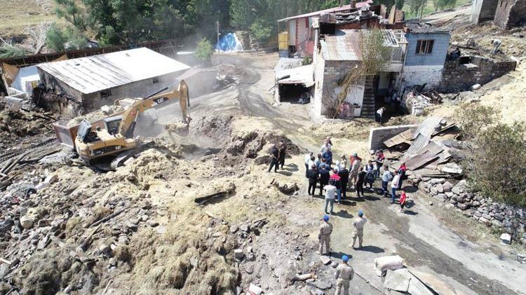 Erzurum'un Yakutiye ilçesinde dün yangında 10 ev ve 17 ahırın yandığı, 16 büyükbaşın da öldüğü kırsal Kırmızıtaş Mahallesi'nde hem hazar tespit çalışması hem de iş makineleriyle temizlik yapılıyor. Mahallede bir haftada 3'üncü kez yangın çıktığını belirten Muhtar Halit Polat, "Bir türlü bunun nedenini öğrenemedik. Biz de psikolojik olarak çöktük. Mahalleli olarak çok büyük tehlikedeyiz. Yatamıyoruz, tedirgin olduk. Bizim psikolojik destek almaya ihtiyacımız var" dedi.