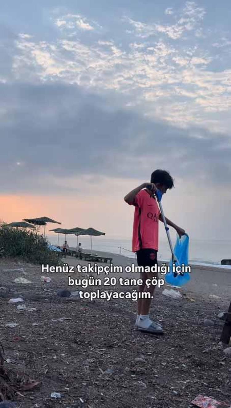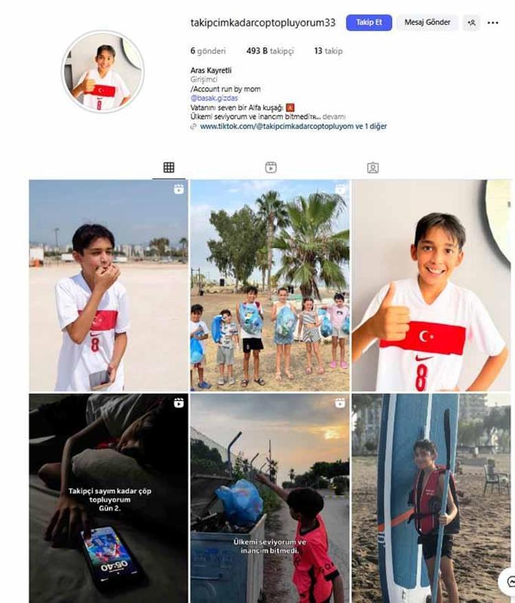 Mersin'in Mezitli ilçesinde sosyal medyada 'Takipçim kadar çöp topluyorum' sloganıyla temizlik hareketi başlatan 11 yaşındaki Aras Kayretli, 493 bin takipçiye ulaştı.