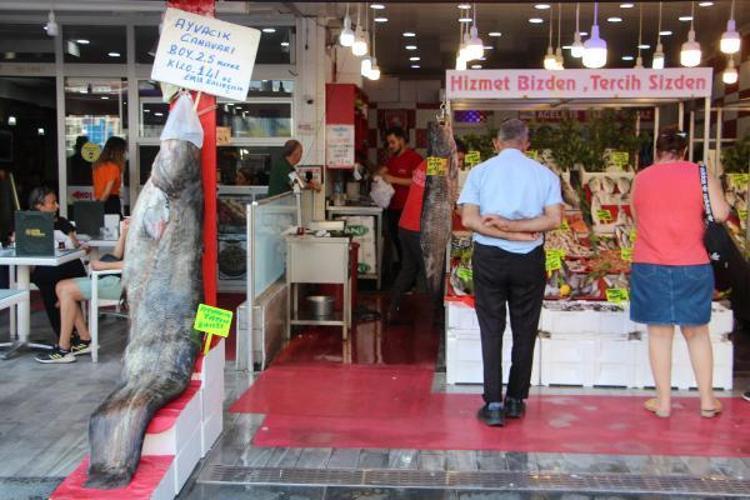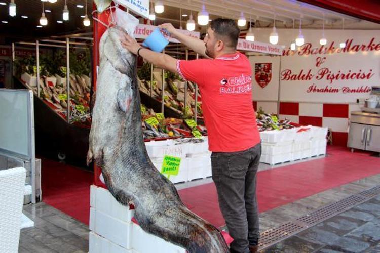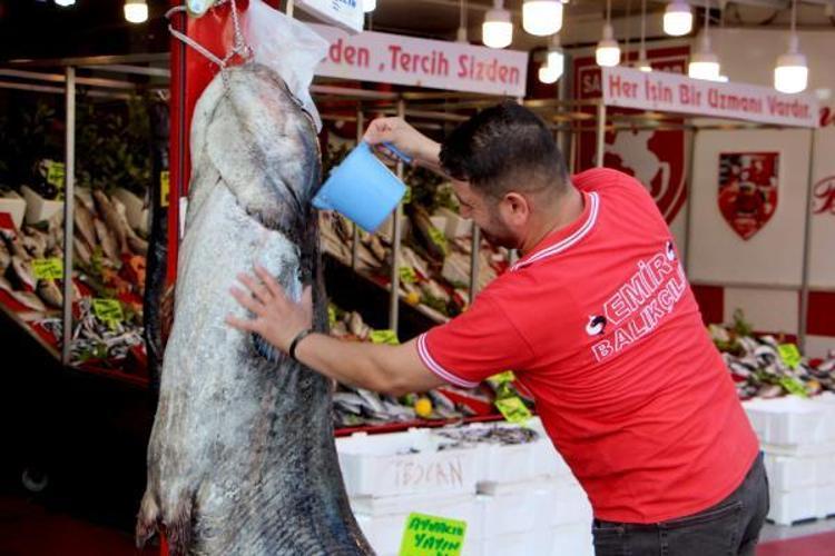 2,5 metre boyundaki 141 kiloluk yayın balığı tezgahta