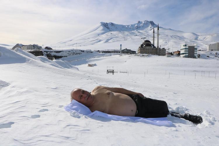 Kayseri’de Davut Güleç, Türkiye’nin önemli kış turizm merkezlerinden olan Erciyes Dağı’nda 2 bin 200 metre yükseklikteki Tekir Yaylası’nda kar banyosu yaptı. Eksi 5 derecede yarı çıplak şekilde karla kaplı yüzeye plaj havlusu sererek kara giren Güleç, “Erciyes’in toz karı özellikle yüksek rakımdan dolayı sağlık açısından önemli. Hava eksi 5 derece bu da benim için çok önemli değil. Burası beni cezbetti” dedi.