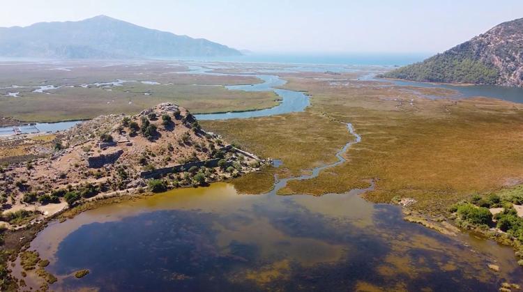 Muğla'nın dünyaca ünlü Dalyan Kanalı'nın kenarında kurulu 3 bin yıllık antik liman kenti Kaunos, havadan görüntülendi.
