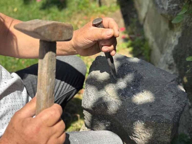 Genellikle kireçli beyaz taş ve siyah bazalt olarak topraktan çıkarıyorum. Bu taşların üzerinde işlemler yaparak, oluşturduğum eserleri bahçedeki diğer heykellerin yanına koyuyorum.