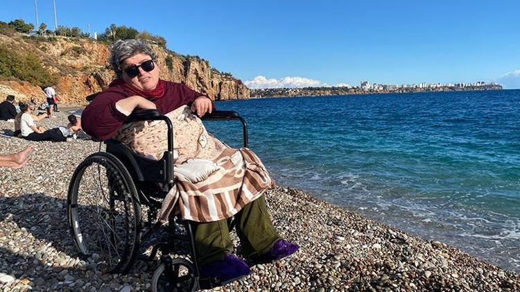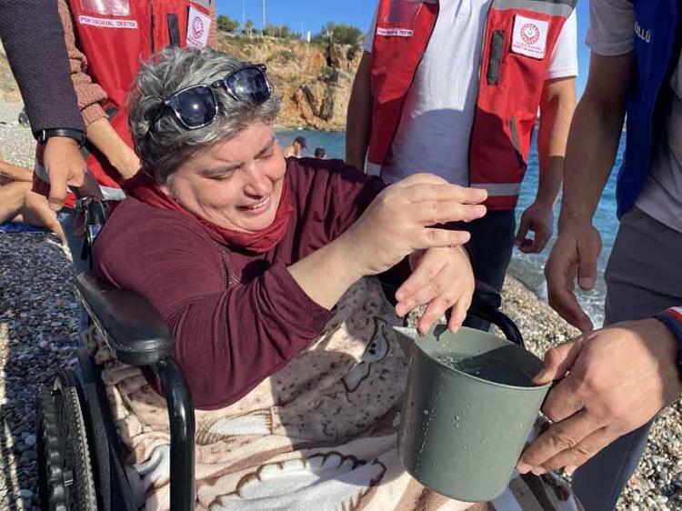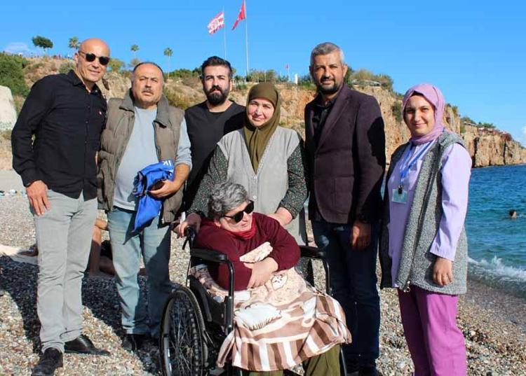 Ambulansla evinden alınan Feride sahil kenarına getirildi. Tekerlekli sandalyeyle denizi en yakın noktadan izleyen Feride, kova yardımıyla deniz suyuna da dokundu.