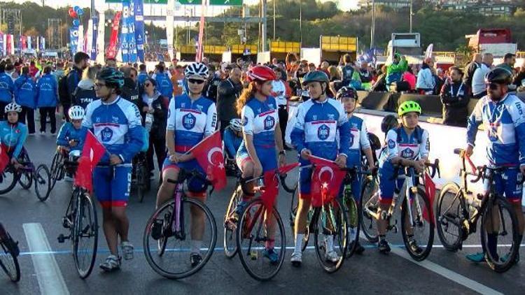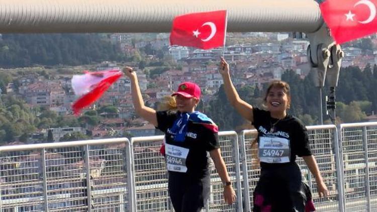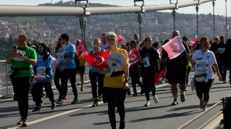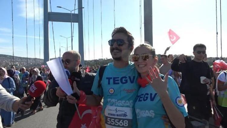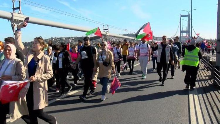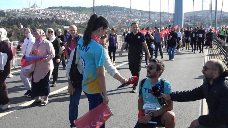 Kimileri ise çocuklarıyla birlikte maratona katıldı. Köprü üstünde vatandaşlar çay, kahve ve simit yiyerek o anların fotoğrafını çekti. Köprüden geçen bir grubun ise Filistin bayraklarıyla yürüdüğü görüldü.