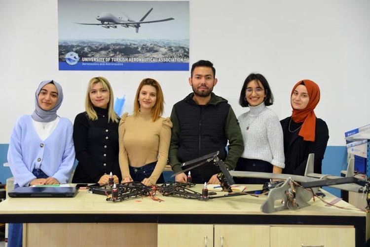 THK Üniversitesi Makine Mühendisliği 2'nci sınıf öğrencileri Rabia Tuana Atak, Şeymanur Sırtlı, Elektrik Elektronik Mühendisliği 2'nci sınıf öğrencisi Beyza Nur Büyükyaprak, Mekatronik Mühendisliği 3'üncü sınıf öğrencisi Duygu Nur Kibar, Bilgisiyar Mühendisliği 2'nci sınıf öğrencisi Ümmühan Şahin'den oluşan 'Burlas' takımı, orman yangınlarının tespiti ve sınır güvenliğinde kullanabilecek hibrit-İHA tasarladı.
