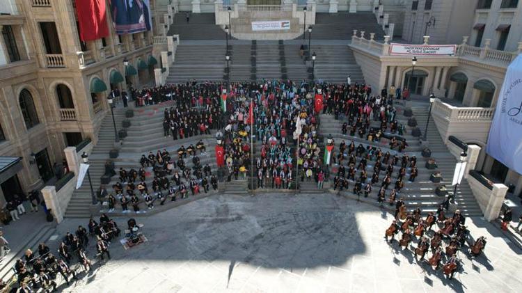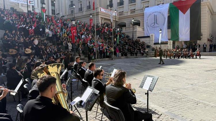 Ankara MGÜ, '2025-2026 Akademik Yılı Açılış Töreni'ni 'İlk Ders Gazze' temasıyla gerçekleştirdi. Törenin ardından, ellerinde Türk ve Filistin bayrakları taşıyan akademisyenler ve üniversite öğrencileri ile MGÜ Müzik İlkokulu, MGÜ Müzik Ortaokulu ve MGÜ Güzel Sanatlar Lisesi öğrencileri Yunus Emre Sevgi Meydanı'na geldi. Akademisyenler ve öğrencilerden yaklaşık 500 kişilik koro, sözlerini Doç. Dr. Elif Nun Gökçe'nin yazdığı, müziğini Fırat Akarcalı'nın düzenlediği 'Can Filistin' isimli şarkıyı seslendirdi.