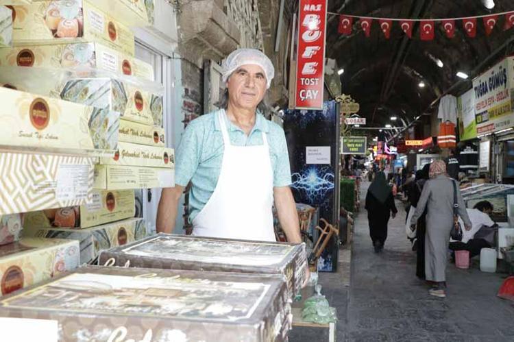 8 asırlık çarşıdaki dükkanda müşterinin gözü önünde yaptığı lokumları satıyor
