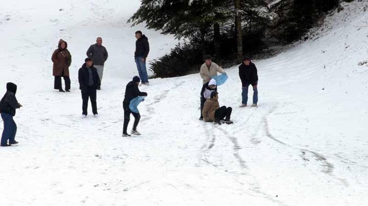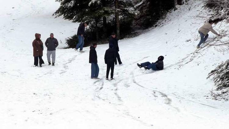 Günü birlik turlarla Abant'a gelen tatilciler kar topu oynayıp poşetlerle karda kayarak eğlendi.