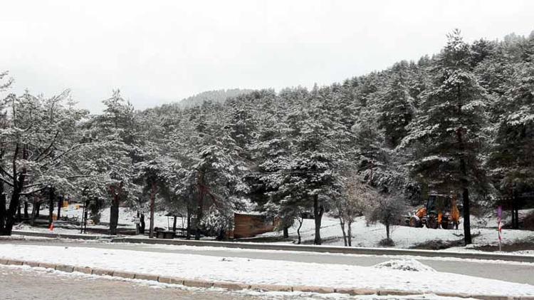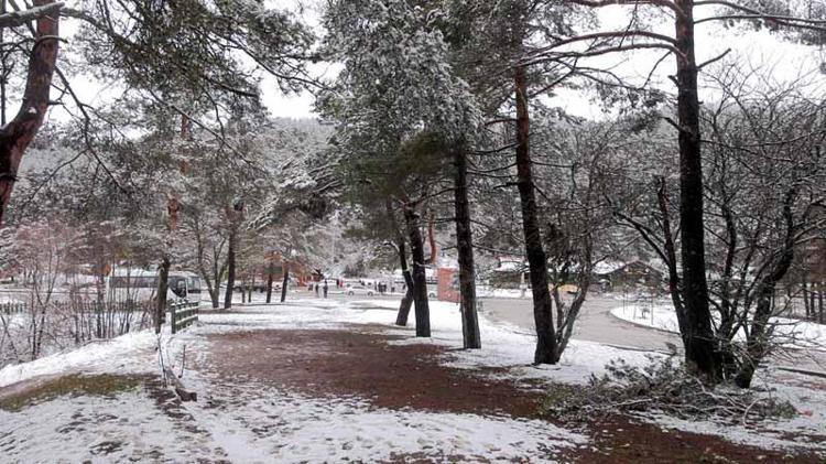 Kar yağışıyla birlikte çam ormanlarıyla çevrili milli park, beyaz örtüyle kaplandı.