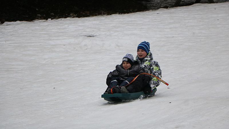Bolu’da sömestir tatili için Abant Gölü Milli Parkı’na gelen çocuklar, karla kaplı tepelerden kaymanın keyfini yaşadı. Etkili olan soğuk hava nedeniyle gölün bir bölümü donarken, ortaya çıkan eşsiz manzara dronla görüntülendi.
