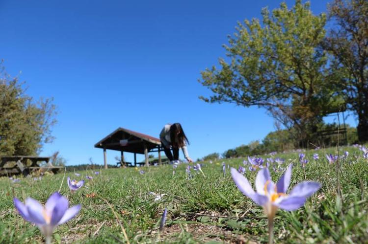 Milli parktaki eşsiz manzara dronla görüntülendi. Göl çevresindeki çayırlarda mavi çiçekleri ile açan yöreye özgü Abant çiğdem çiçekleri de milli parka renk kattı.