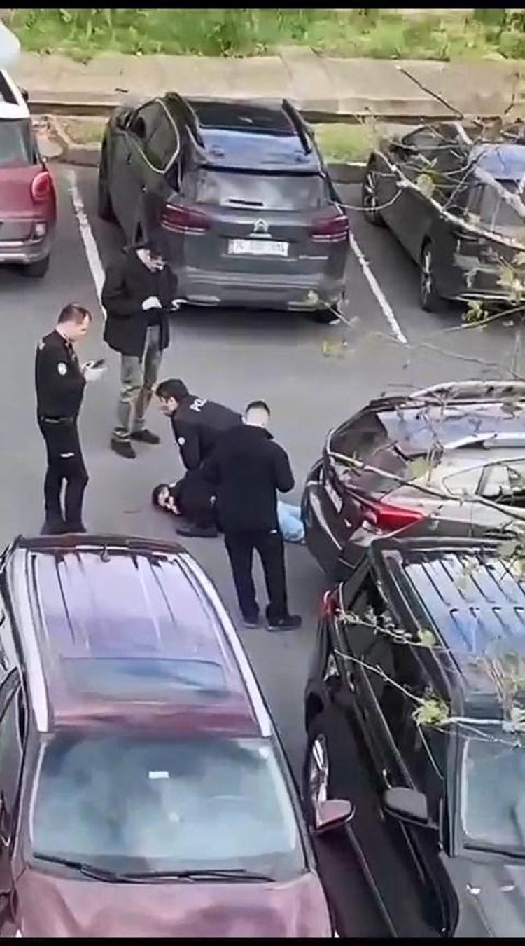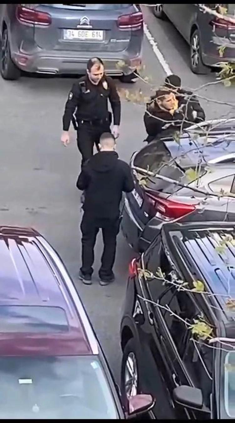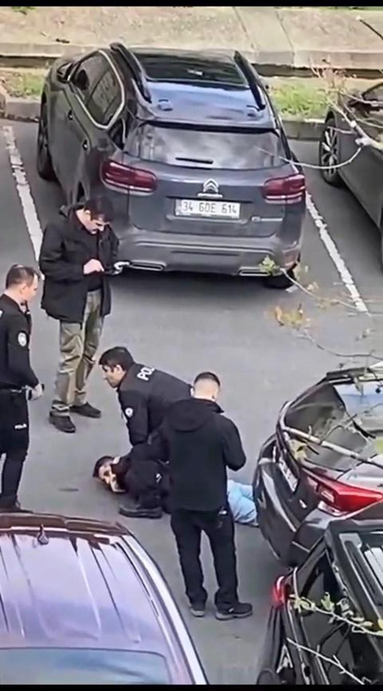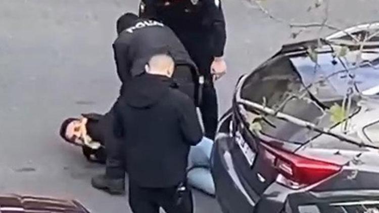 Görüntülerde, polisin yakaladığı şüpheliyi yere yatırarak kelepçelediği ve daha sonra ayağa kaldırarak üst araması yaptığı görülüyor.