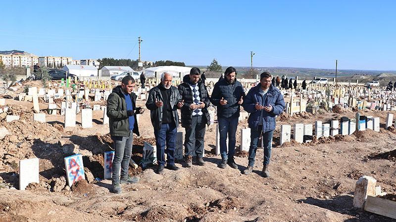 Adıyaman Belediye Mezarlığı'nda gazetecilerin mezarlarını ziyaret eden Adıyaman Faal Gazeteciler Cemiyeti Başkanı İbrahim Arslan ve dernek üyeleri, depremde kaybettikleri meslektaşları için dua etti.