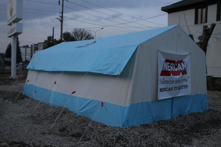 Kahramanmaraş'ta meydana gelen depremden etkilenen Adıyaman'da yayın yapan Mercan TV binasının hasarlı olması nedeniyle kurulan çadır içerisinde yayın hayatını sürdürüyor.