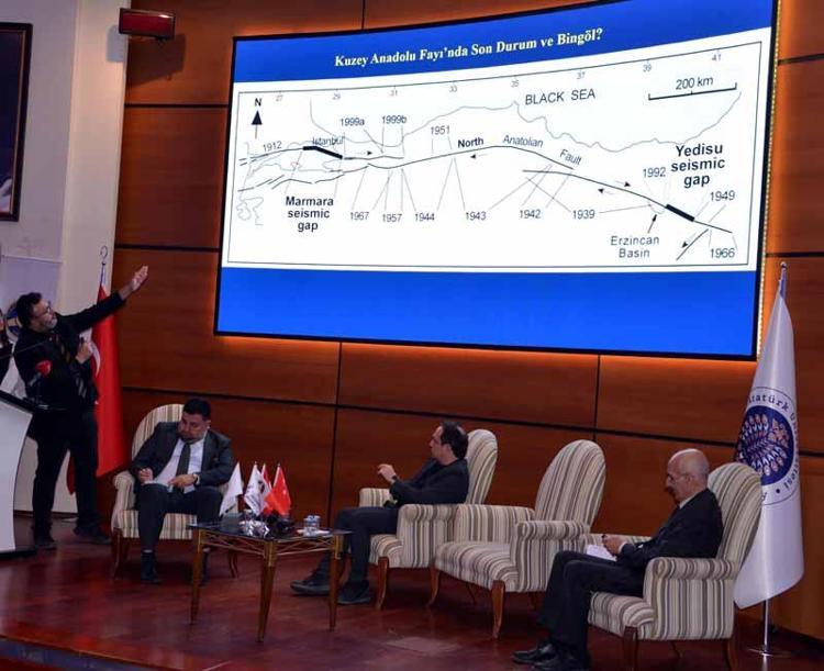 Kültür Merkezi’nde moderatörlüğünü Atatürk Üniversitesi Afet Haberleşmesi ve Teknolojileri Koordinatörü Dr. Öğretim Üyesi Faruk Baturalp Günay’ın yaptığı panelde konuşan Bingöl Üniversitesi Enerji, Çevre ve Doğal Afet Uygulama ve Araştırma Merkezi Müdürü Dr. Öğretim Üyesi Kenan Akbayram, Kuzey Anadolu Fayı’nda 1949 yılından başlayan bir deprem silsilesi yaşandığını söyledi. Fayda genel olarak batı yönlü bir deprem göçü olduğunu belirten Akbayram, “Yani yaklaşık 50 yılda meydana gelen depremler Marmara’ya kadar gelen Kuzey Anadolu Fayı’nın büyük bir kısmını kırmış. İki kısım kırılmamış. Birisi İstanbul’un güneyindeki Marmara sismik boşluğu diyebileceğimiz bölge diğeri de Yedisu. Bu iki bölgede tehlikemiz çok yüksek. Kahramanmaraş depremleri 13 ilimizi etkiledi. Çok büyük bir ihtimalle Yedisu Fayı’nda olacak bir depremde bu bölgede birçok ilimizi etkileyecek. Bütün şehirler tarumar olacak demiyoruz ama şehirlerde sismik riskin yüksek olduğu alanlarda yıkımlar olacaktır maalesef eğer hazırlanmazsak. Erzurum, Erzincan, Tunceli, Elazığ’ın bir kısmı, Muş, Diyarbakır ve Bitlis etkilenebilir. Belli bir çerçevede yaklaşık 100-150 kilometrelik bir dairede depremin merkez üssünü Yedisu olarak kabul edersek etkileme imkanı var” diye konuştu.