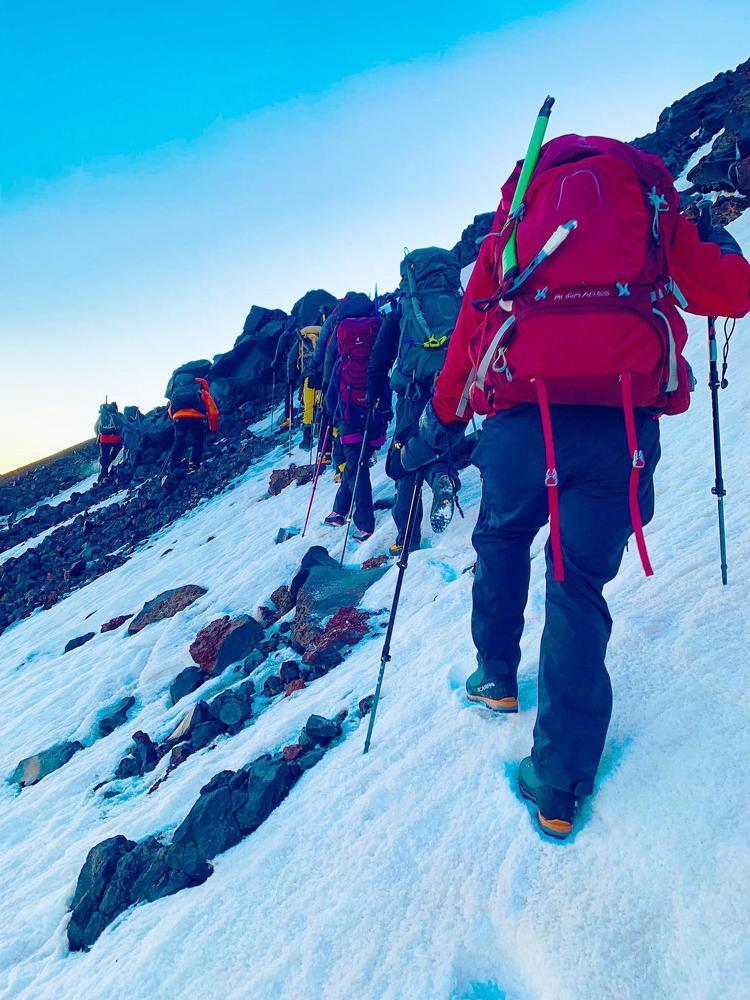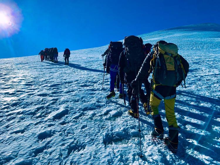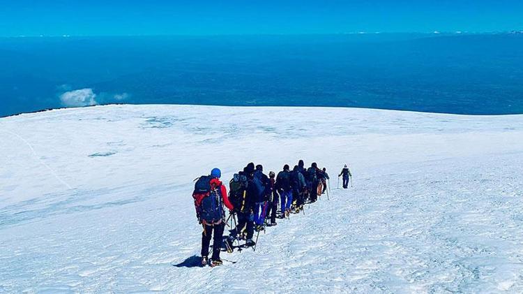 4 bin 700 metrede başlayan buzullarda, çatlaklara düşmemek için aynı iz üzerinde ilerleyen dağcılar, 5 bin metredeki buzul platosunda klasik rotadan gelen dağcılarla karşılaştı.
