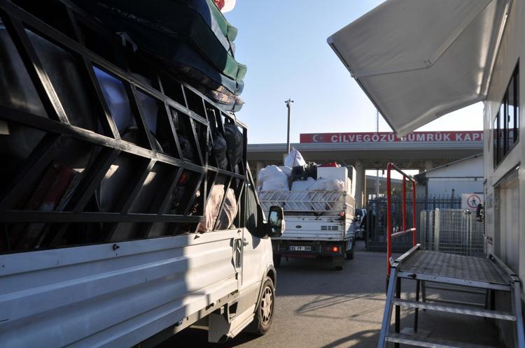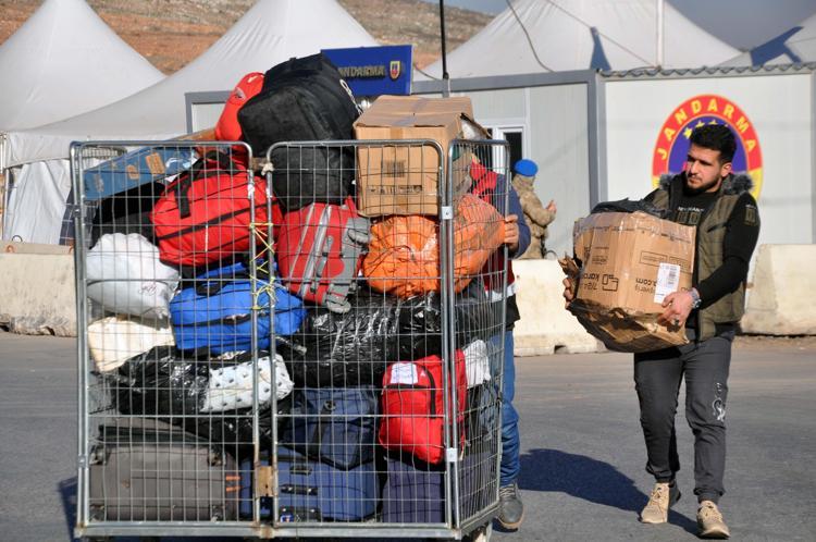 Sabahın ilk ışıklarıyla gümrük kapısına gelen Suriyeliler, Göç İdaresi Başkanlığı'nın mobil hizmet aracından işlemlerini yaptırıp, beraberinde getirdikleri eşyalarla birlikte ülkelerine geçiyor.