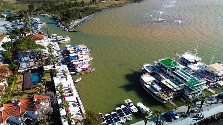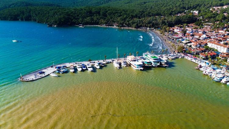 Muğla'nın Ula ilçesinin 'Sakin Şehir' ünvanlı Akyaka Mahallesi'nde sağanak ve fırtına sonrası denizin rengi, kahverengiye döndü. Ortaya çıkan manzara, dronla görüntülendi.