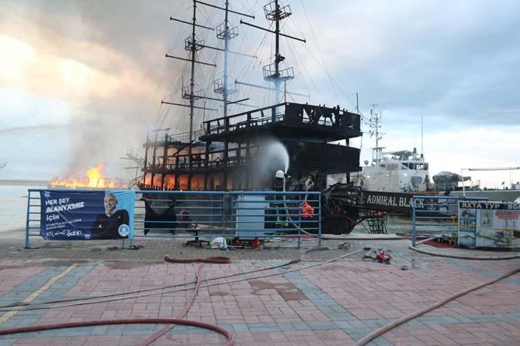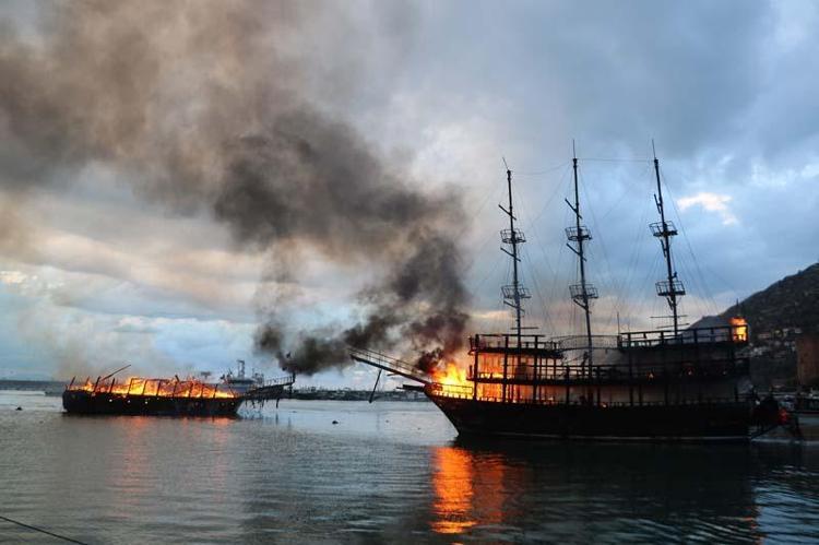 Alanya Balıkçı Barınağı'nda saat 06.30 sıralarında bir gezi teknesinde yangın çıktı. Kısa sürede büyüyen alevler, bitişikteki tekneye de sıçradı. 2 teknenin alevlere teslim olduğu yangına Antalya Büyükşehir Belediyesi ve Alanya Belediyesi’ne ait itfaiye ekipleri ile Alanya Sahil Güvenlik Bot Komutanlığı ekipleri müdahale etti.