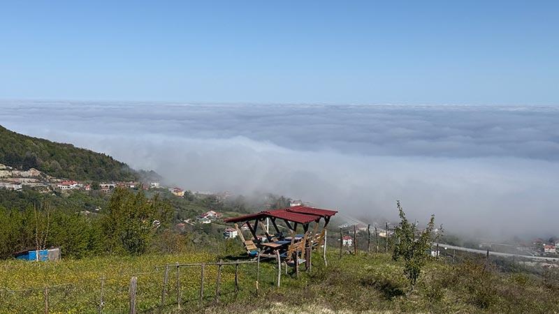 Denizden karaya doğru uzanan sis nedeniyle eşsiz manzara oluşurken, ilçeye gelen turistler Amasra'yı tepeden gören Ahatlar köyü Bakacak mevkisinde bol bol fotoğraf çekti.