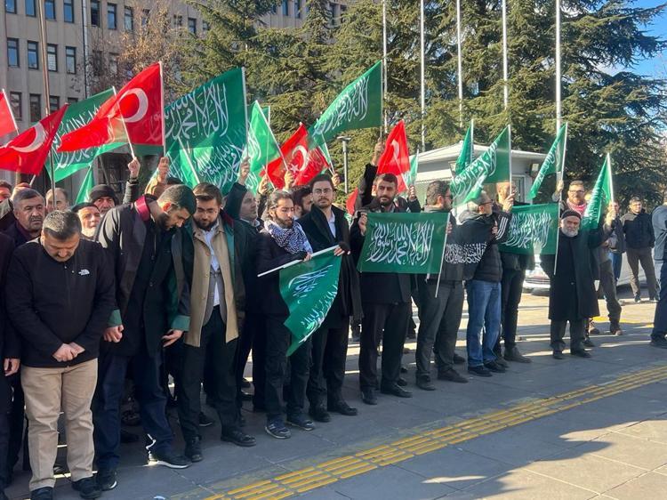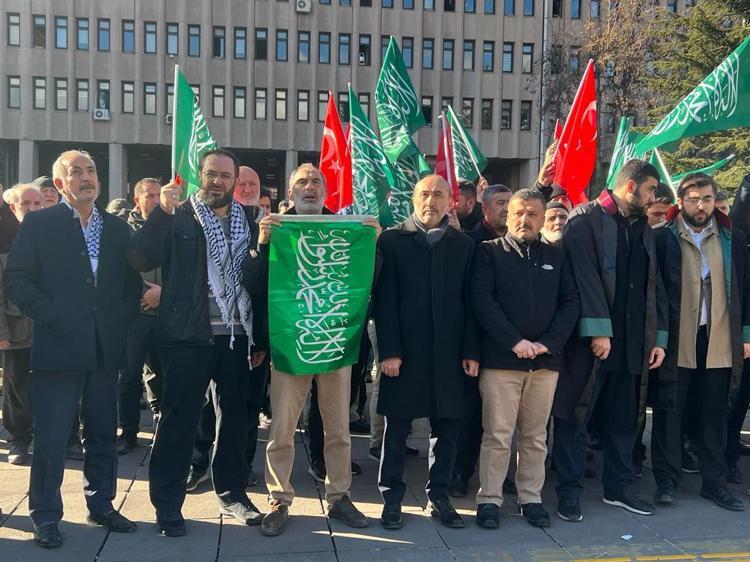 Ankara Filistin Dayanışma Platformu üyeleri, İstanbul'da Kelime-i Tevhid bayrağı açılması ile ilgili Ankara Barosu'nun suç duyurusuna tepki göstermek için Ankara Adliyesi önünde açıklama yaptı.