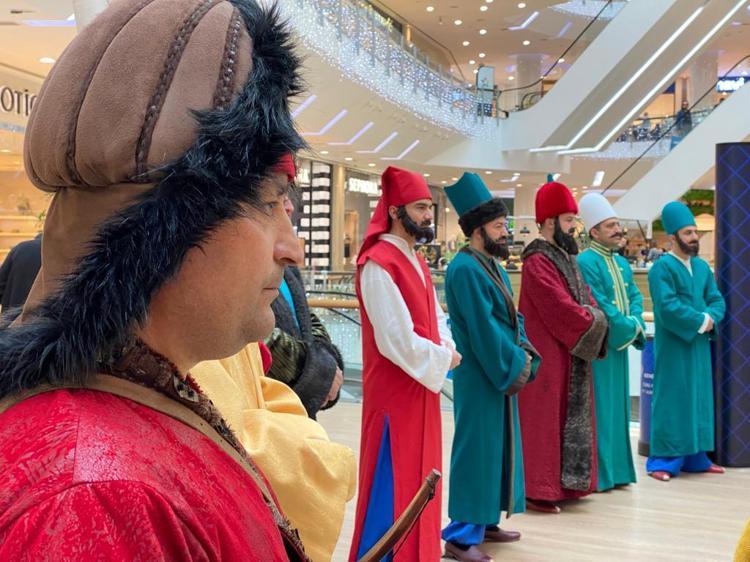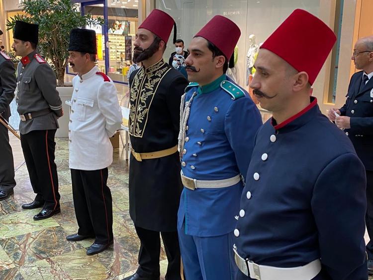 Alışveriş merkezini gezen vatandaşlar, kıyafetlerin hangi dönemlere ait olduğu hakkında görevlilerden bilgi alarak polislerle fotoğraf çektirdi.
