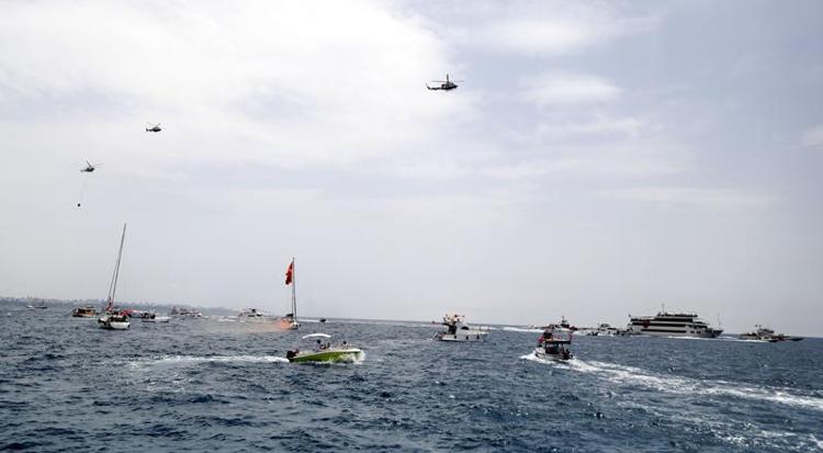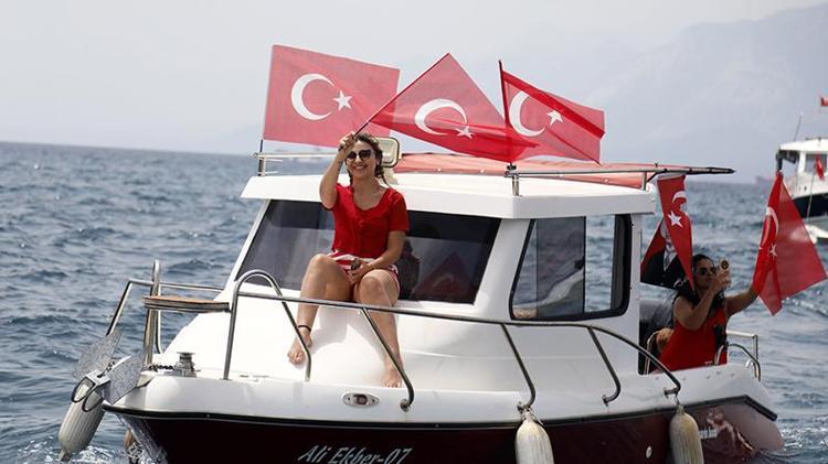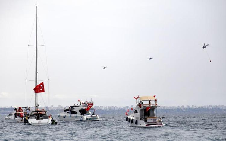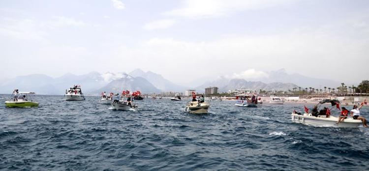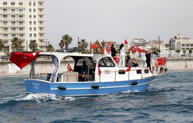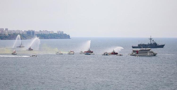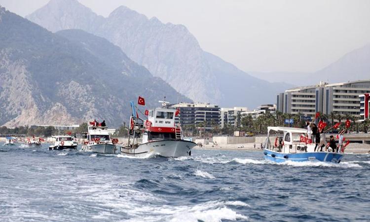 Antalya'da 150'ye yakın balıkçı teknesi, Milli Mücadele ve kurtuluşun adımının atıldığı Bandırma Vapuru'na ithafen denizde teknelerle kortej yaptı.
