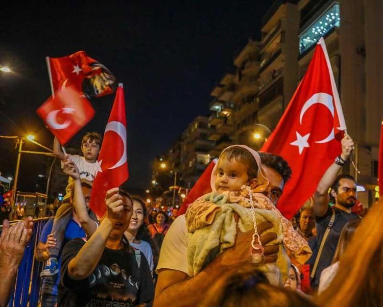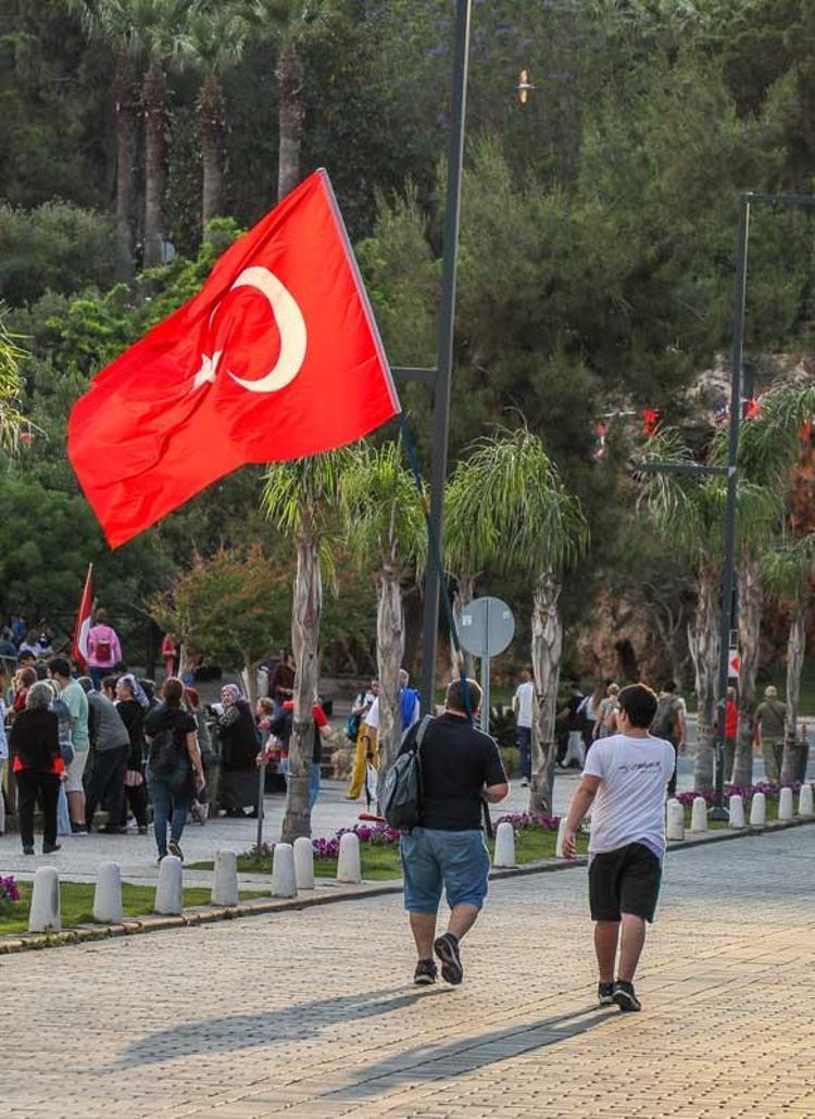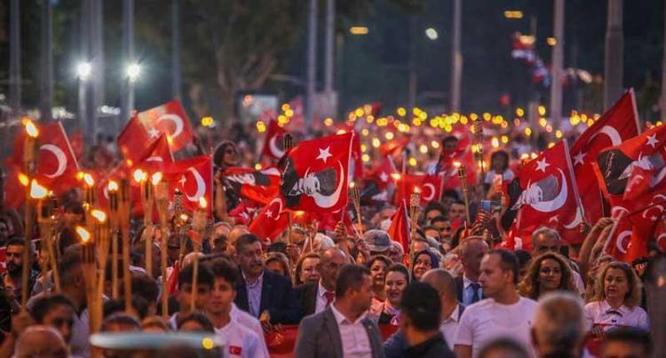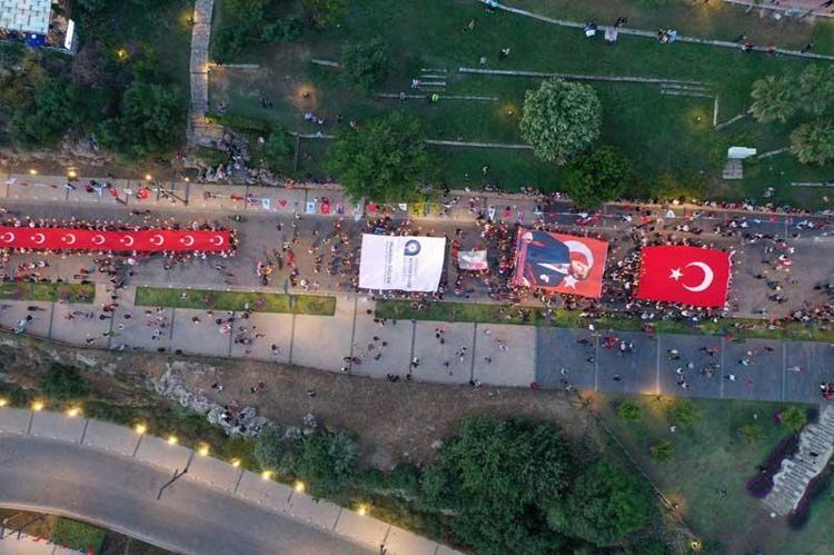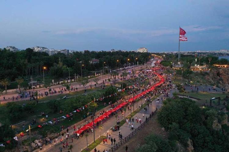 Kortejin önünde ‘Cumhuriyet İçin Antalya El Ele’ yazılı pankart taşınırken, ellerinde bayrak ve meşalelerle yürüyen vatandaşlar sloganlar atıp marşlar söyleyerek yürüdü. Kortejde yürüyenler arasında kentte yaşayan yerleşik yabancıların olduğu görülürken, bazı çocuklar ise ebeveynlerinin omuzlarında yürüyüşe katıldı.
