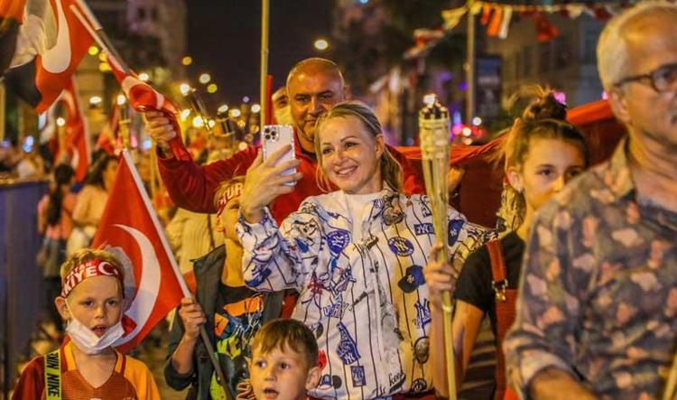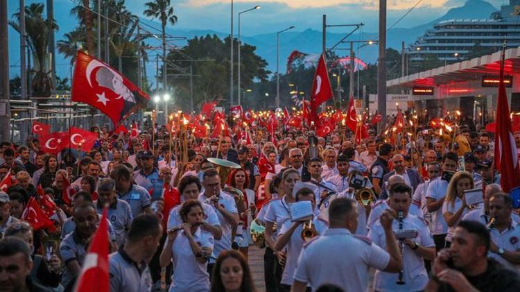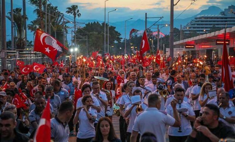 Katılımcılar grubun önünde bulunan Antalya Büyükşehir Belediyesi Bandosu’nun çaldığı marşlara eşlik ederek Konyaaltı Caddesi’ni takiben Cumhuriyet Meydanı’na ulaştı. Fener alayının ardından meydanda Burcu Güneş ve Emircan İğrek konser verdi.