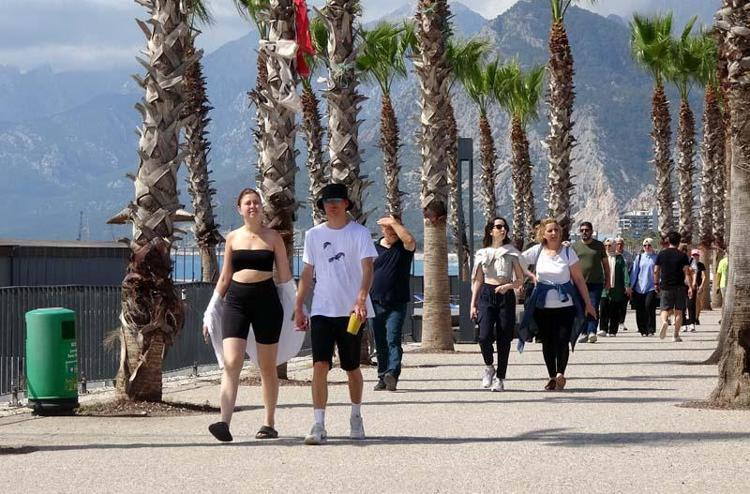Hava sıcaklığının 21, deniz suyu sıcaklığının 22, nem oranının yüzde 58'e ulaştığı kentte, güzel havanın tadını çıkarmak isteyen tatilciler Konyaaltı Sahili'ne geldi.