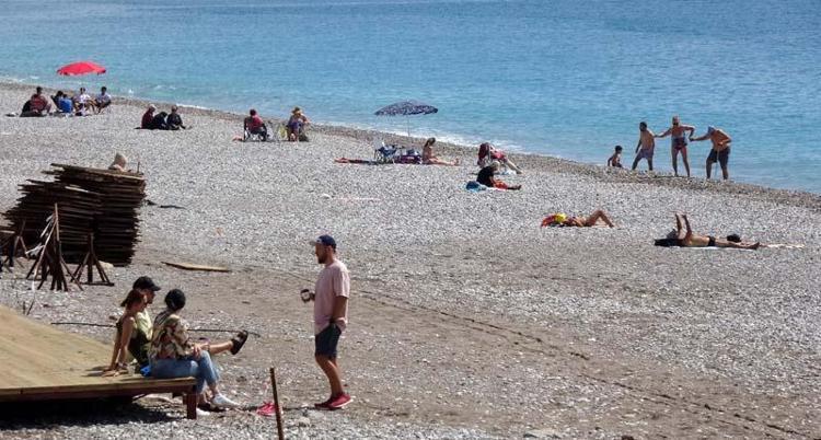 Sahil kenarında yürüyüş yapanların ve manzarayı izleyenlerin yanı sıra sahil bandında da yoğunluk göze çarptı. Sahile gelen tatilcilerden bazıları güneşlenirken, bazılarıysa Akdeniz'in mavi sularında yüzmenin tadını çıkardı.