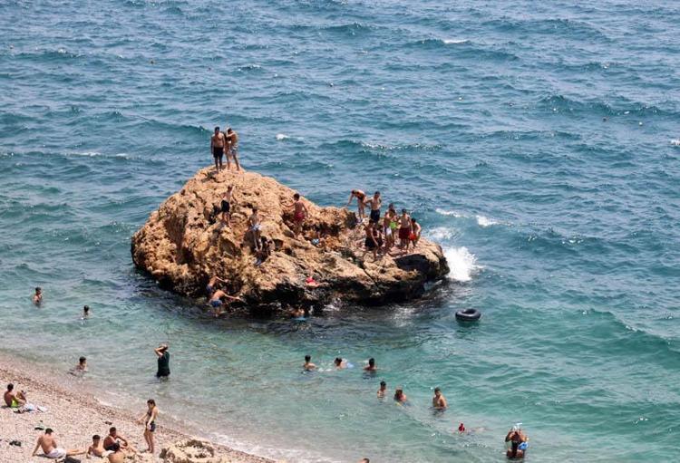 Denizden esen rüzgar serinletmeye yetmeyince vatandaşlar, çareyi 30 derece sıcaklıktaki denize girmekte buldu. Turizm sezonunun en yoğun günlerinin yaşandığı Konyaaltı Sahili'nde yoğunluk dikkati çekti. Kimileri plaj şemsiyelerinin gölgesinde serinlemeye çalışırken, bazılarıysa tehlikeye aldırmadan kayalıklardan denize atladı.