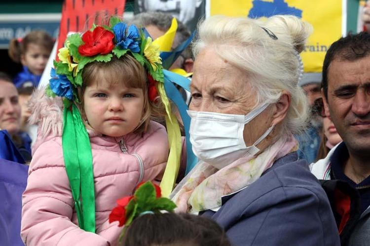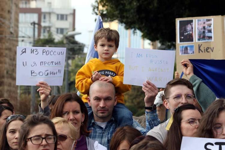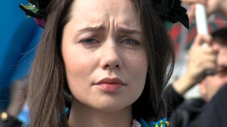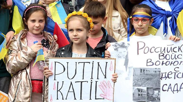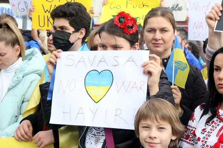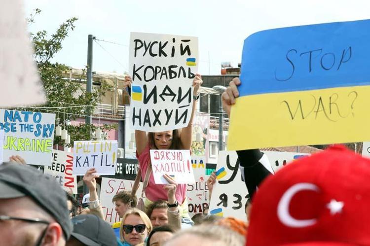 Ülke bayrağını taşıyan Ukraynalıların, yüzlerine de mavi sarı boya sürdüğü göze çarptı. Ukraynalılar, 'Savaşa Hayır, Savaşı Durdur, Putin Katil, Ukrayna Yanıyor Susma, Putin= Hitler' yazılı İngilizce, Rusça ve Ukraynaca dövizler taşıdı.