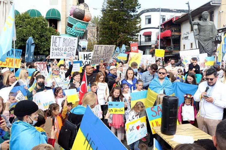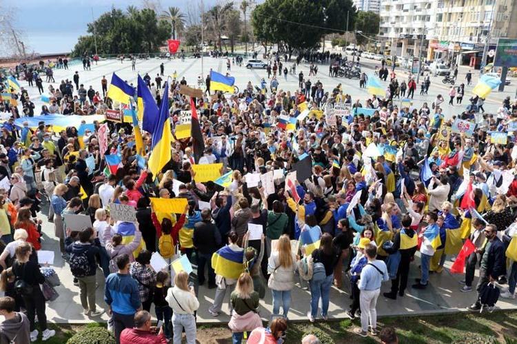 Antalya'da yaşayan Ukraynalılar, Rusya'nın Ukrayna'ya saldırısı nedeniyle Attalos Heykeli önünde basın açıklaması yaptı. Basın açıklaması sırasında çok sayıda Ukraynalı bebekleri ve çocuklarıyla birlikte alanda hazır bulundu.