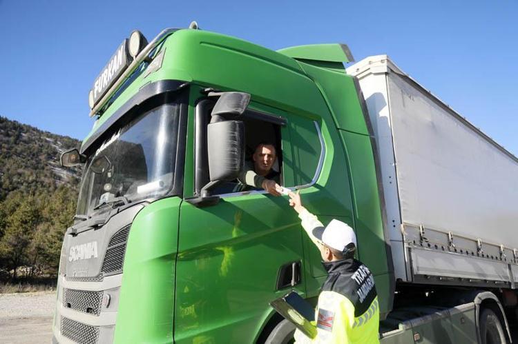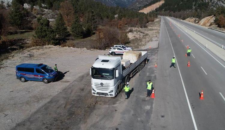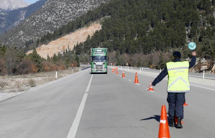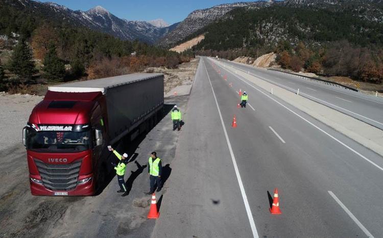 Otobüs, TIR, kamyon, kamyonet, minibüs başta olmak üzere ticari tüm araçlar Antalya- Konya kara yolundaki uygulama noktasında durdurularak lastik kontrolü yapılıyor. Kış lastiği olan araçlarda ayrıca lastik diş derinliği de inceleniyor.
